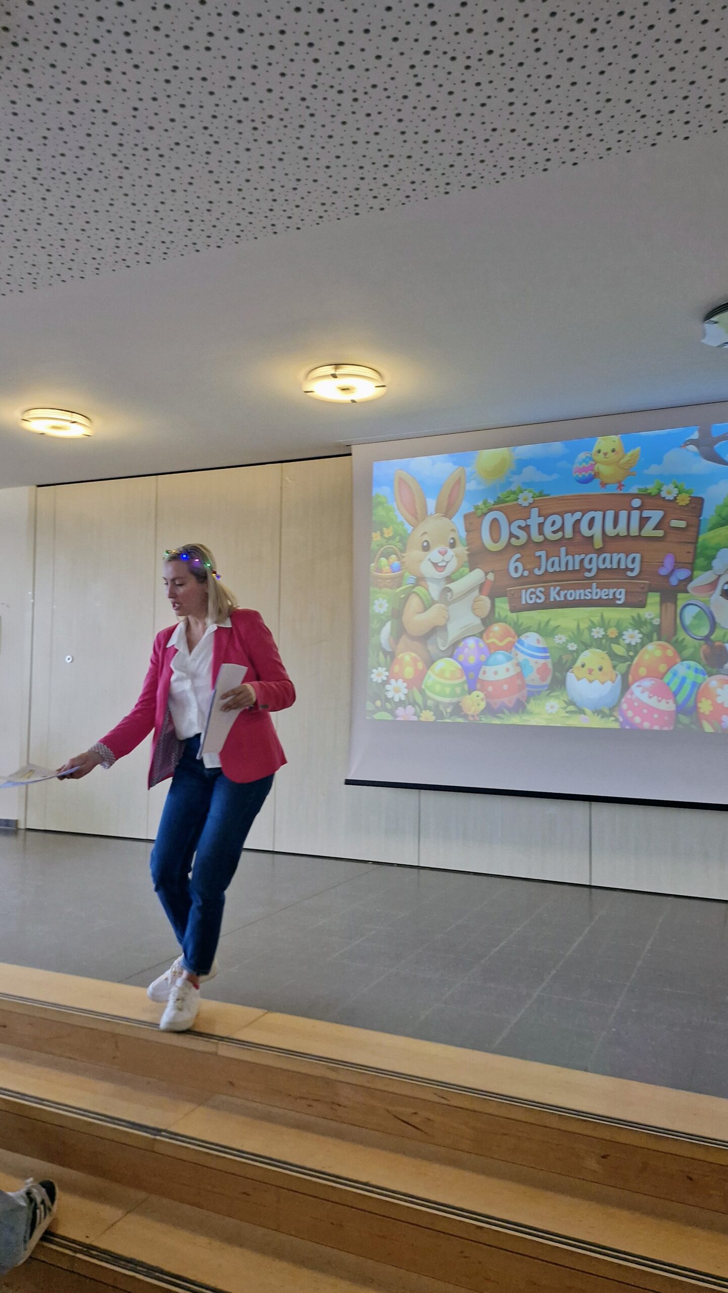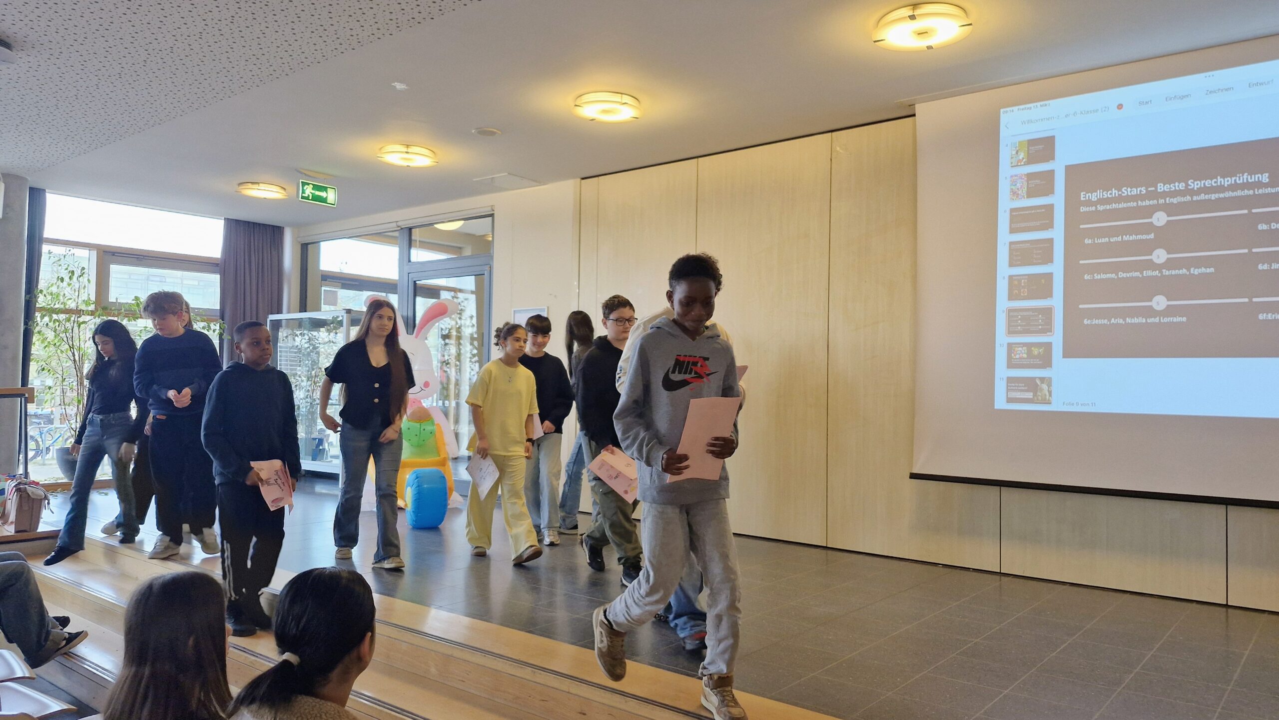 Zusätzlich zu den allseits bekannten und allseits beliebten Siegerehrungen für verschiedene Kategorien gab es dieses Mal auch einen schönen Film mit vielen Bildern aus dem laufenden Schuljahr und so Einstimmung auf die große Überraschung: Am Ende der Versammlung gab es auch einen Riesen-Osterhasen und ein Osterquiz, bei dem die Schülerinnen und Schüler des 6. Jahrgangs noch viele Fakten über Ostern lernen konnten.